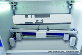 3、雙重?cái)_度償機(jī)構(gòu)--上滑塊配有斜鍥式補(bǔ)償,下工作臺(tái)具有油缸自動(dòng)補(bǔ)償,可以有效地補(bǔ)償滑塊與工作臺(tái)的擾度,真正地實(shí)現(xiàn)無盲區(qū)補(bǔ)償,確保折彎?rùn)C(jī)精度。